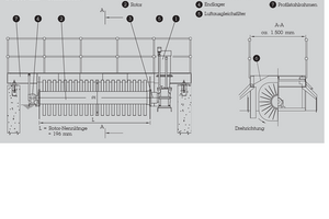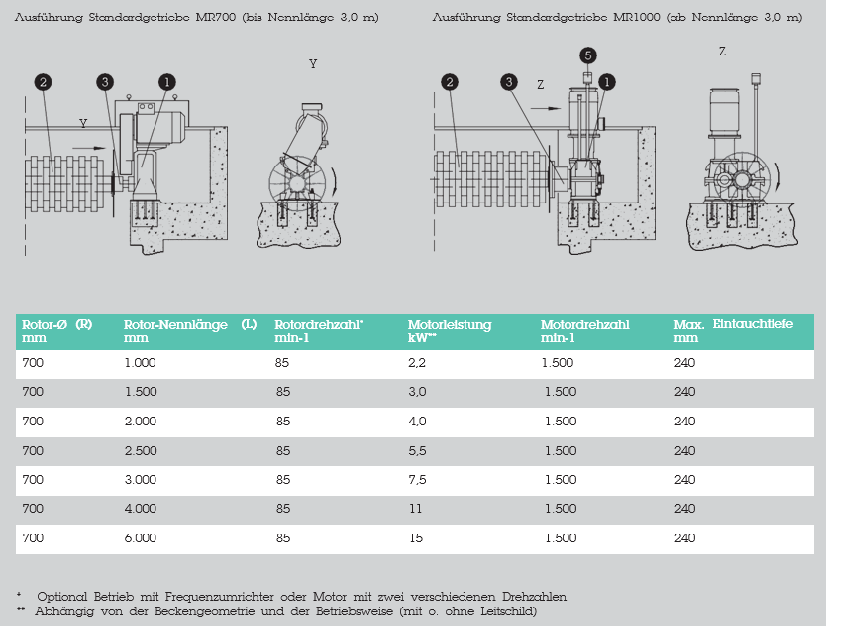 - Ablaufwehre zur Regelung der Eintauchtiefe des Mammutrotors und des O2-Eintrags mit Hand- oder Elektroantrieb
