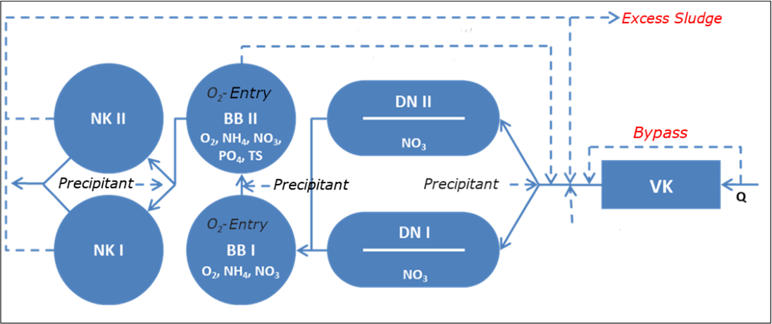 Wastewater treatment takes place in two parallel lines, each with an upstream denitrification stage and two intermittently aerated nitrification tanks that are flowed through one after the other. Control is via various ammonium and nitrate probes as well as oxygen, orthophosphate and inflow measurements.