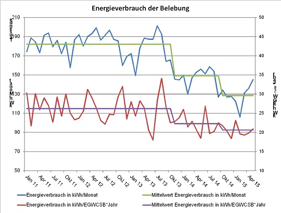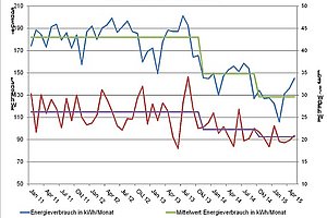 A recent analysis revealed an actual energy conservation of 30% (see diagram), which exceeded the expectations. Based on the actual energy costs of 19.8 ct/kWh and a monthly energy conservation of average 53,500 kWh, the actual savings amount to 127,300 € per year, reducing the amortization time to approx. 3.3 years. The total energy consumption of the biological stage in relation to the load has improved from 26.2 to 20.6 kWh/(PECOD*year). The following diagram demonstrates the savings during the individual optimization stages. The average outlet parameters in terms of overall nitrogen concentration are far below 5 mg/l.