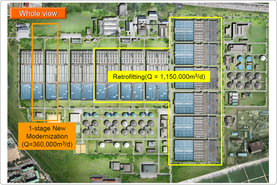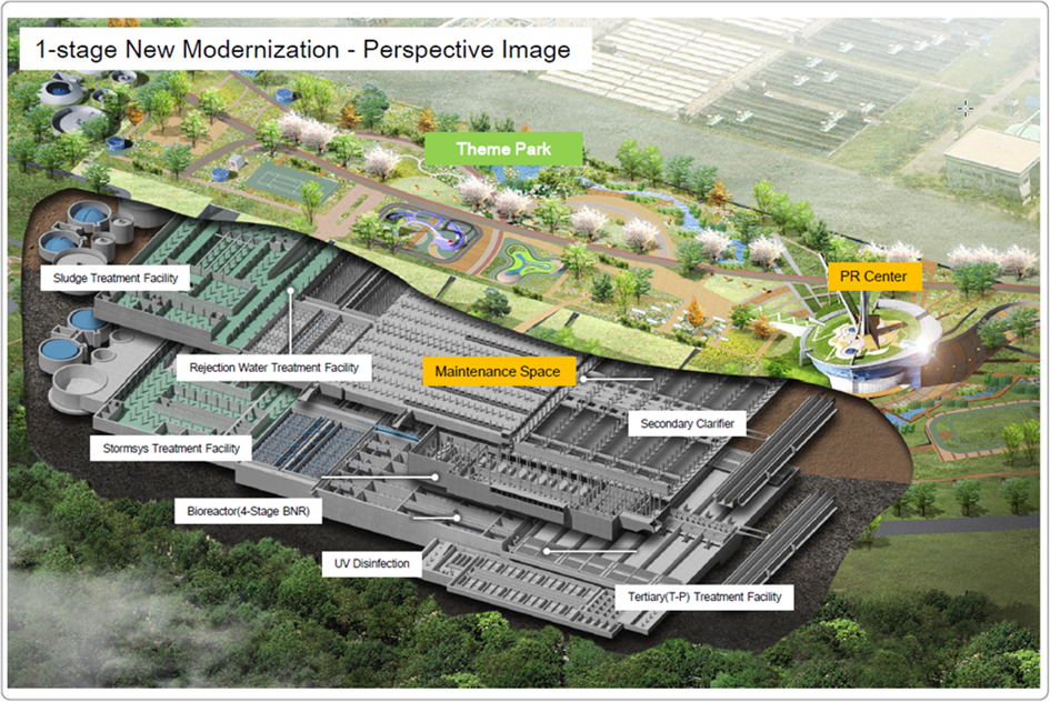 The Seonam wastewater treatment plant treats the wastewater of a large part of Seoul, the capital of South Korea. It is designed for a population of 5.6 million and will be modernized in several steps. The project has a total volume of approx. 1.3 billion dollars. The wastewater treatment plant is installed underground and includes a park above with an information and leisure centre. Most modern and high-performance components have been used for this conversion work.
