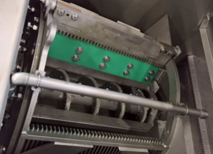 During the cleaning cycle the rotating rake lifts the collected solids to the upper vertex and drops it into the centrically arranged spiral press. This discharge movement is supported by the spray bar, which flushes off captured solids, furthermore an additional cleaning comb removes all remaining residues. The screenings are transported, washed, drained and compacted, whereby the volume will be reduced by 70% and a degree of dryness of about 35-40% or more can be achieved (depends on the screenings).