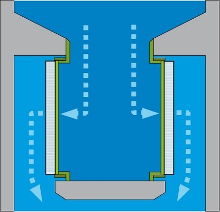 As the last cleaning stage for water intakes, finest screening/filtration is of particular importance to protect downstream equipment such as pumps and condensers reliably against clogging. Passavant-Geiger Centre-Flow (In-to-Out) Travelling Band Screens are the well proven design variant of conventional Travelling Band Screens for minimized life cycle costs and the most efficient extraction of fine debris. Many of our machines have been running successfully at sites for over 40 years on seawater and river water applications.