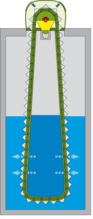 Depending on site requirements, the mesh panels are either flat or roof/halfround-shaped. With roof or halfround-shaped mesh panels a higher efficiency of the machine size can be achieved and bigger particles cannot drop back so easily. Special features are the maintenance-free side bar chains to guide the mesh panels, a highly efficient, scale- like sealing between the screening elements, chain and curved guidings as well as the chain track on the clean water side. The adjustable band speed allows optimum adaptation of the flow rate and screen washing. Excellent cleaning of the mesh panels is achieved by means of an intense washing; the wash water system is adjustable and controllable via local/remote control. A nozzle cleaning device with automatic control is available as an option. The chain tension can be adjusted from the operating floor level. For sea water applications, the chains and chain guidings should be protected against corrosion by means of efficient special anodes forming part of our long proven and project-tailored cathodic corrosion protection system with impressed current.