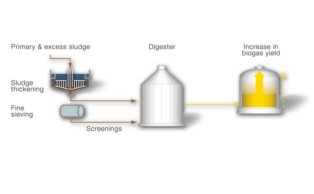 Passavant® CarbonExtract® with Noggerath® drum screen RSH-MG is an attractive alternative to conventional preclarification, not only because of its significantly smaller dimensions. An optional flocculation unit enables a considerably increased extraction of the carbon. The highly organic screenings can be used in an anaerobic sludge stabilisation (Digestion) to produce biogas or by combustion/gasification technologies.